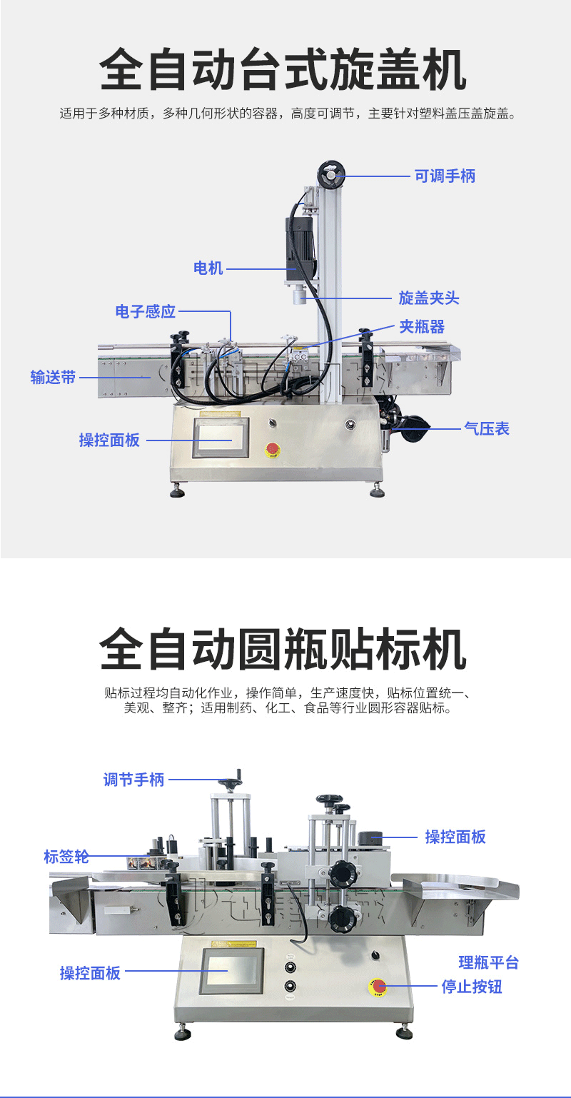 產品說明:桌面型膏液灌裝生產線根據灌裝范圍選擇型號,灌裝部分為雙頭下潛式灌裝機,適用于不同物料不同瓶子的灌裝,配備自動壓蓋機和圓瓶貼標機,可實現不同蓋子的旋蓋貼標工作。