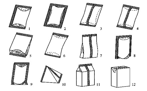 袋裝的形式多種多樣,可分為大袋和小袋。而用于食品銷售包裝的各種小袋主要有以下幾種。如下圖所示。